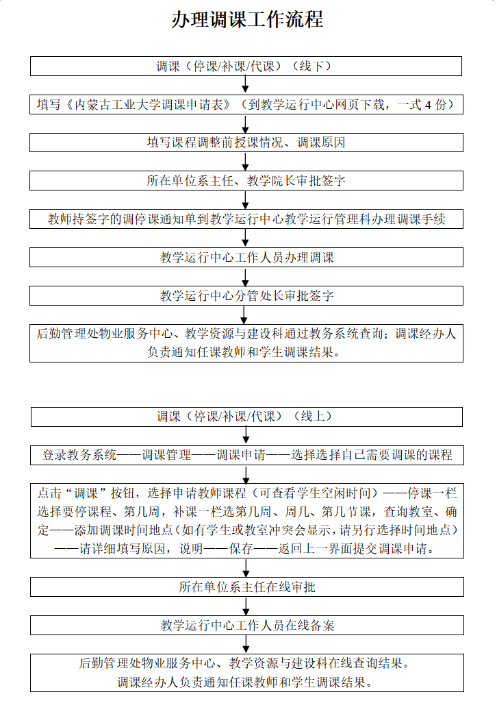 1、调停课实行逐级审批制度,教师在填写并提交调停课申请后,先后经开课单位系主任批准批准、教学运行中心工作人员备案通过,调课方为有效,中间任一环节审批不通过,调课均无效。